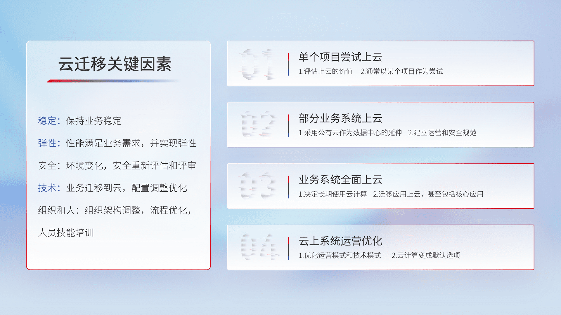 结合实际业务,,,,从规划设计、、、云平台选型、、云原生改造、、、数据迁移、、、、集成交付,,,迁移全过程为客户识别最佳上云路径,,做好风险识别管理,,,,设计网络架构、、、身份权限、、安全审计合规、、操作审计、、、、日志审计、、监控告警策略、、多站点容灾设计等,,,,对云上基础设施进行整体规划,,,,提升IT治理水平,,,以满足弹性、、、、高可用、、、、高性能的需求。。。。